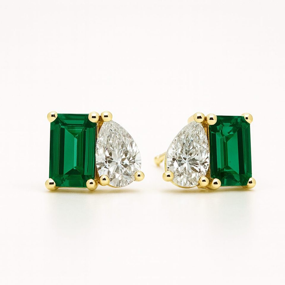 9K Yellow Gold 1.39 Ct Lab Diamond and Emerald Toi et Moi Studs