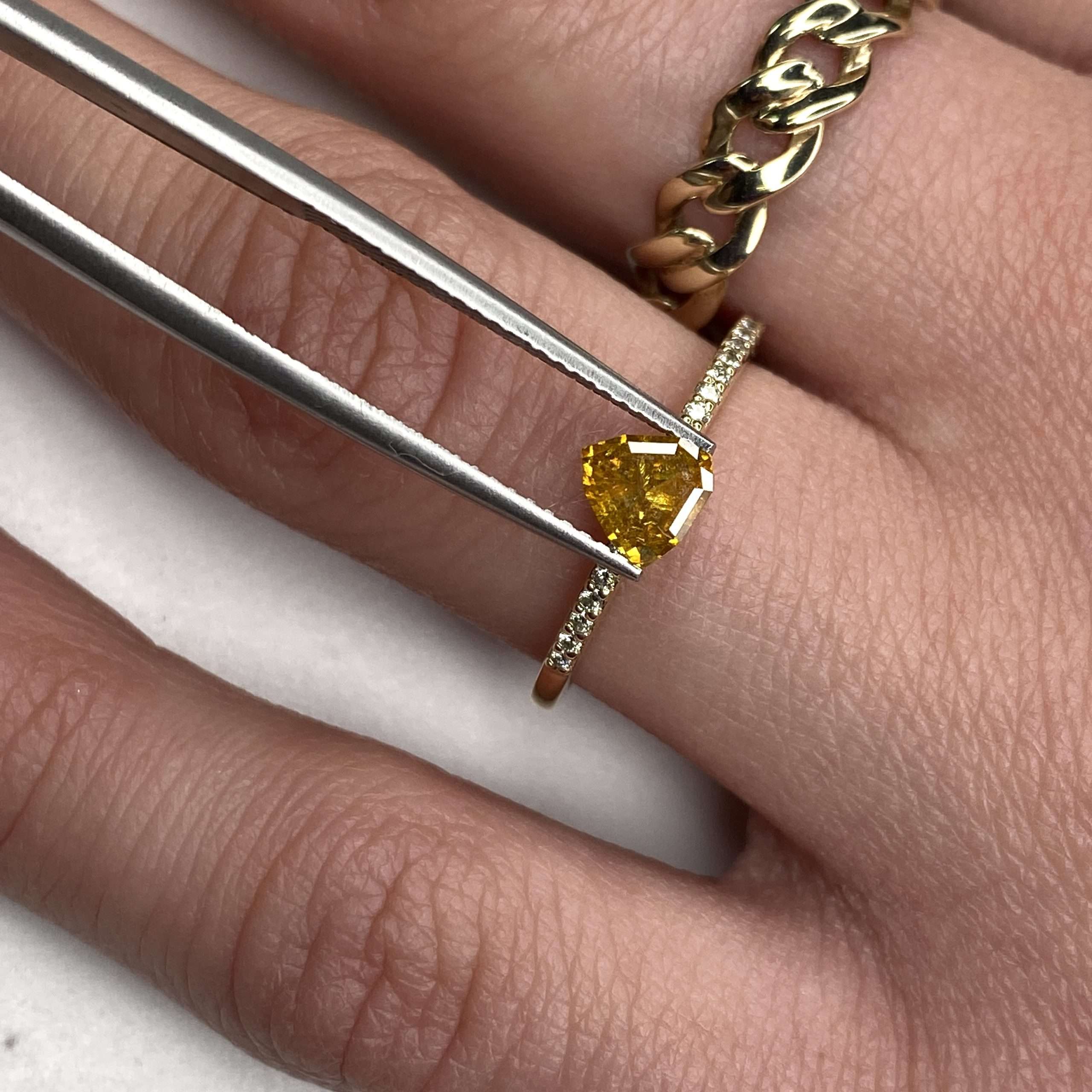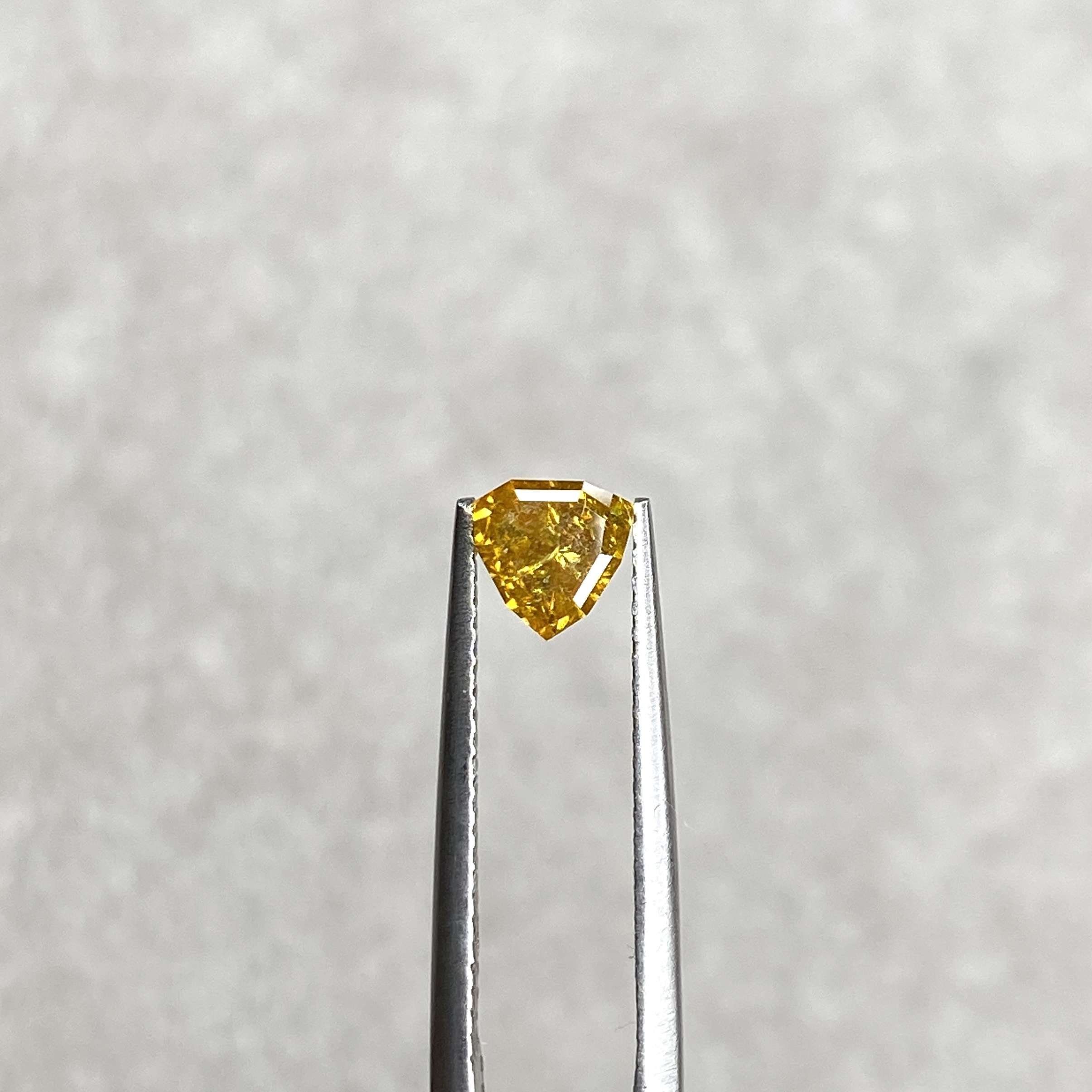 Celebrate individuality with this remarkable 0.54 Ct Fancy Vivid Slightly Orange Yellow Trilliant Natural Diamond—a gemstone that perfectly blends bold colour, modern design, and natural beauty.
