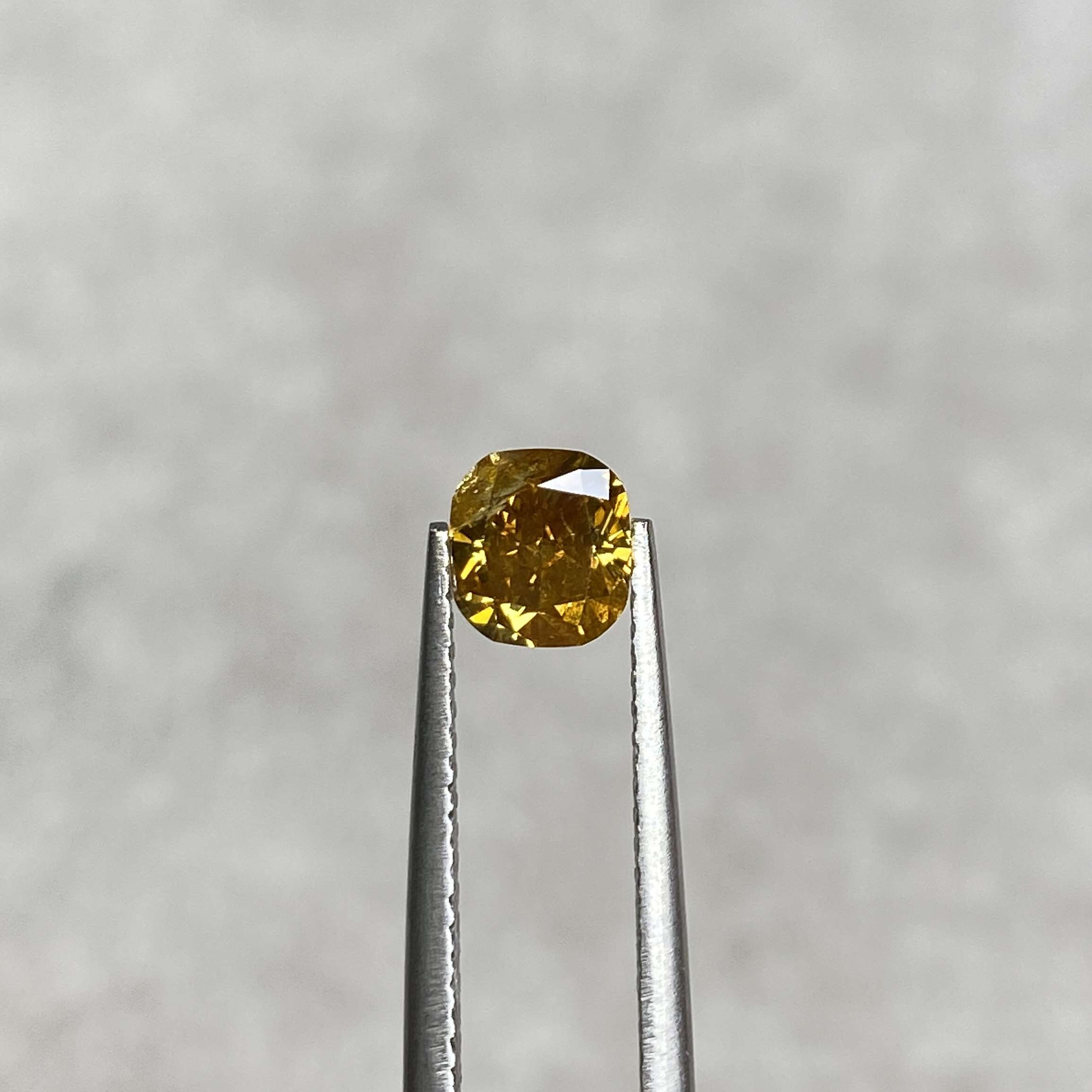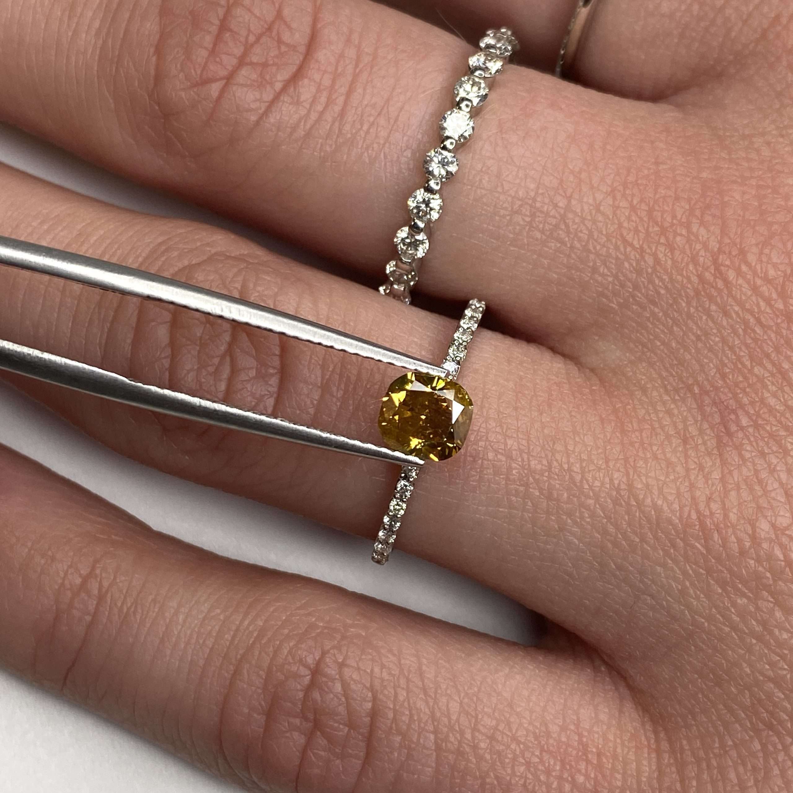 Introducing the 0.82 Ct Vivid Fancy Brownish Yellow/I2 Cushion Diamond —a captivating and rare gem that infuses your jewellery collection with a burst of natural colour and exceptional brilliance.