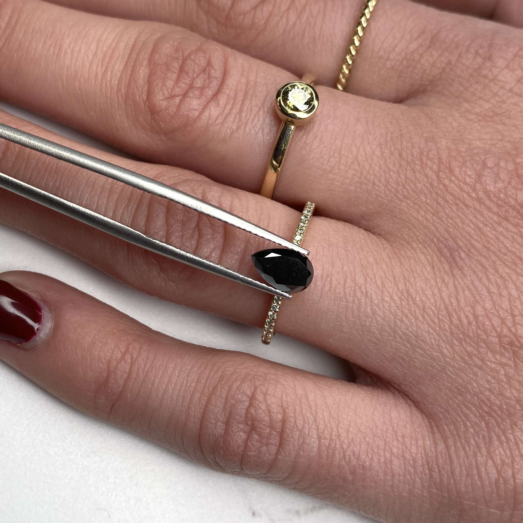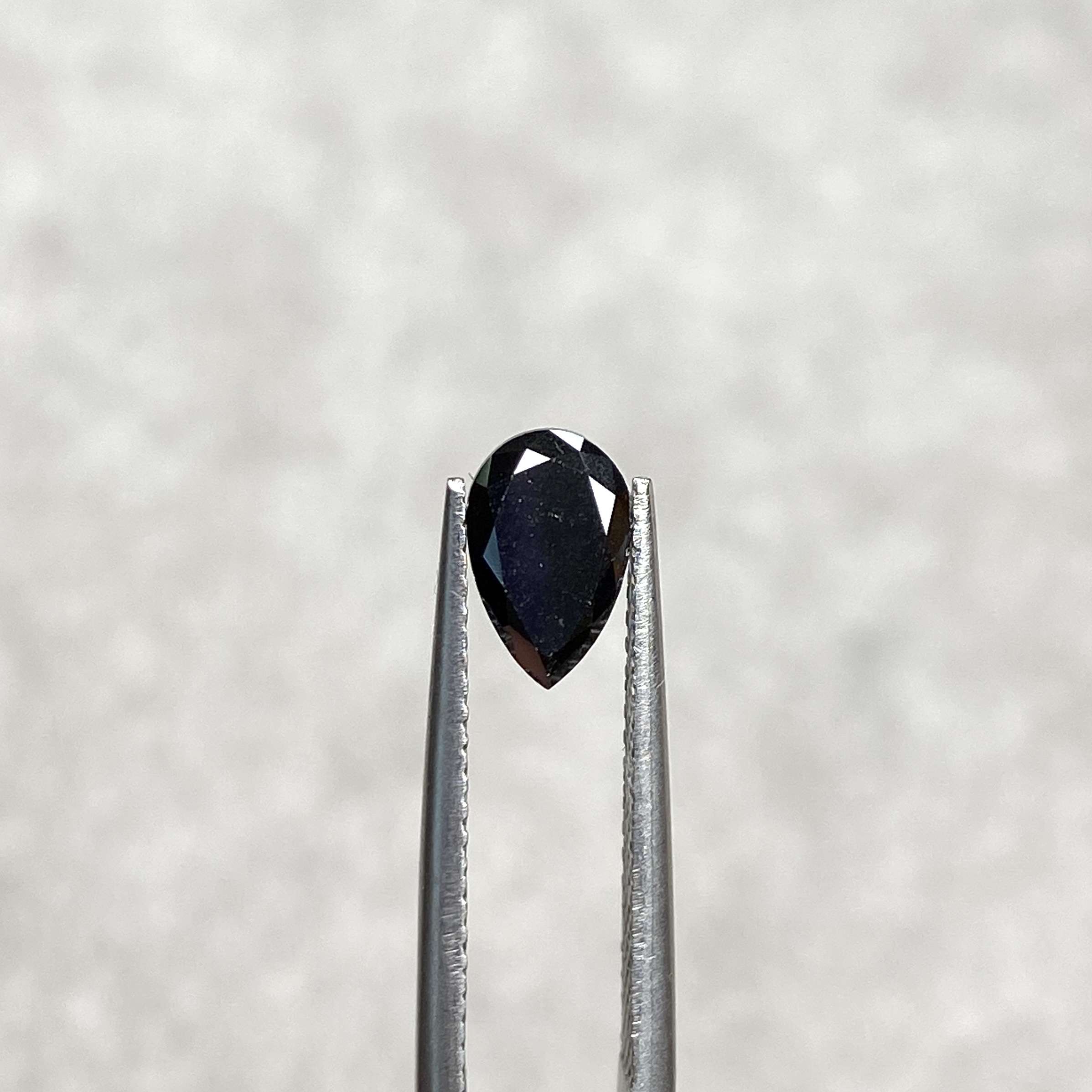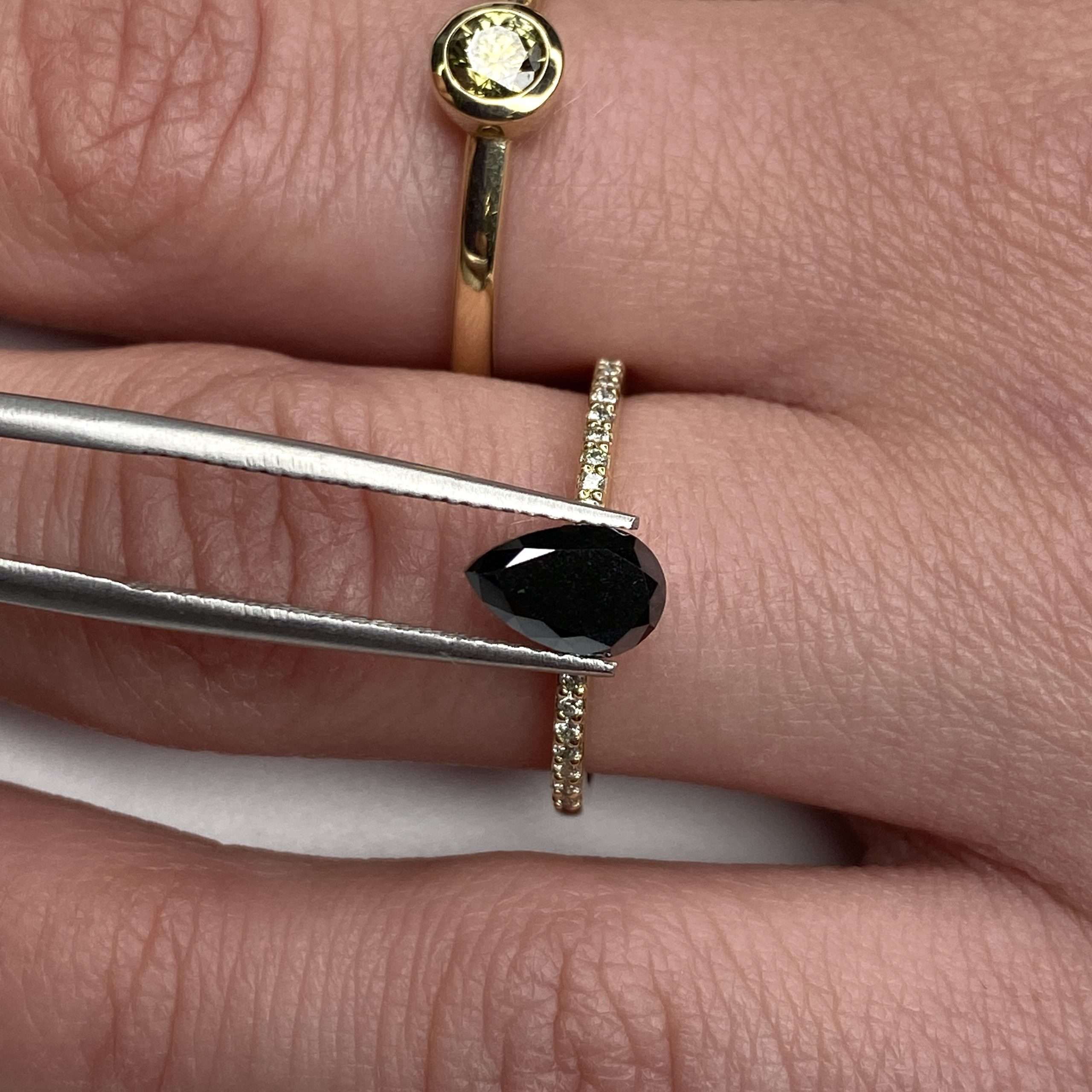 This striking black diamond has been treated to achieve its rich, lustrous hue, creating a deep colour that stands out beautifully in both contemporary and classic jewellery designs. The elegant pear cut combines soft curves with a refined point, producing a graceful teardrop shape that enhances the stone’s visual presence.