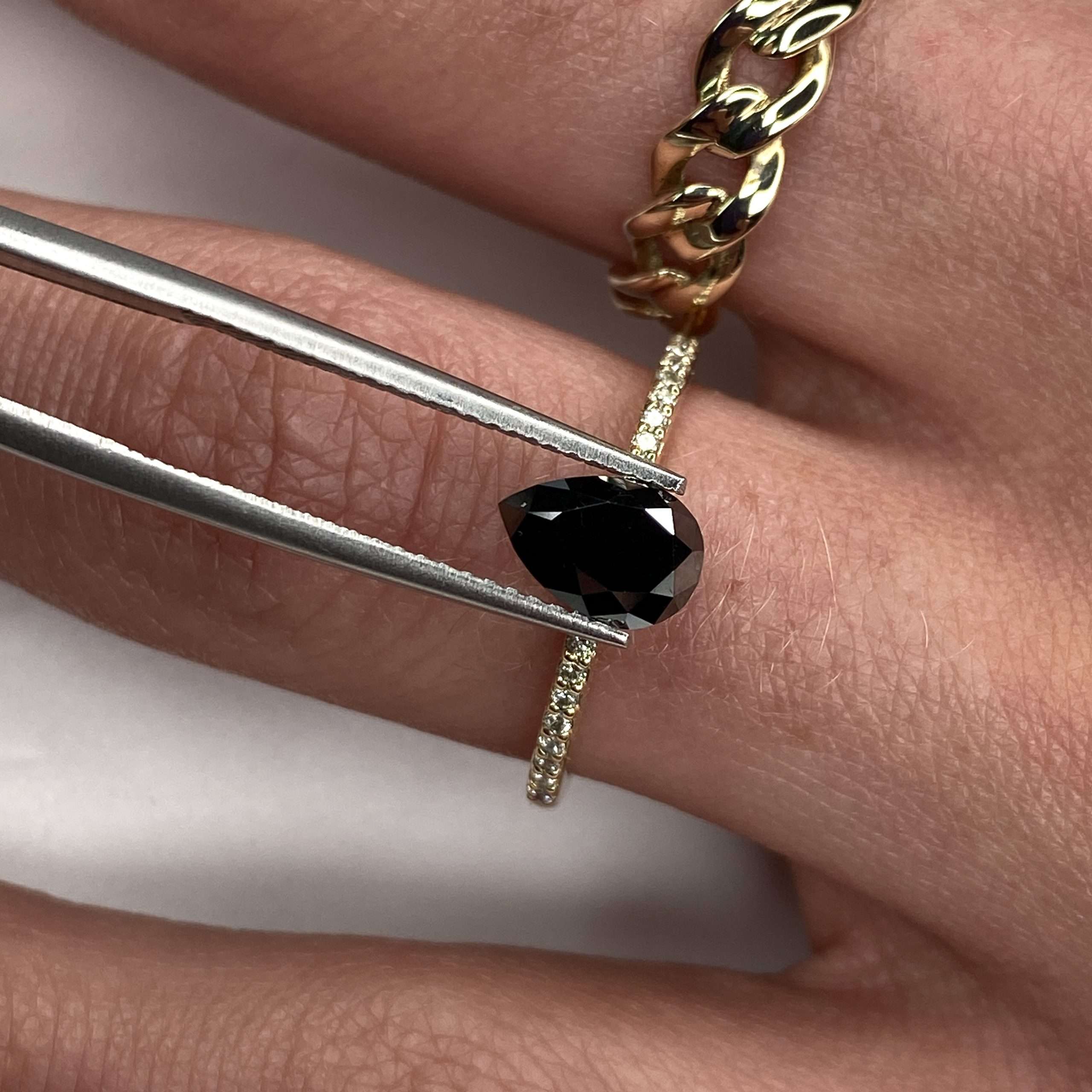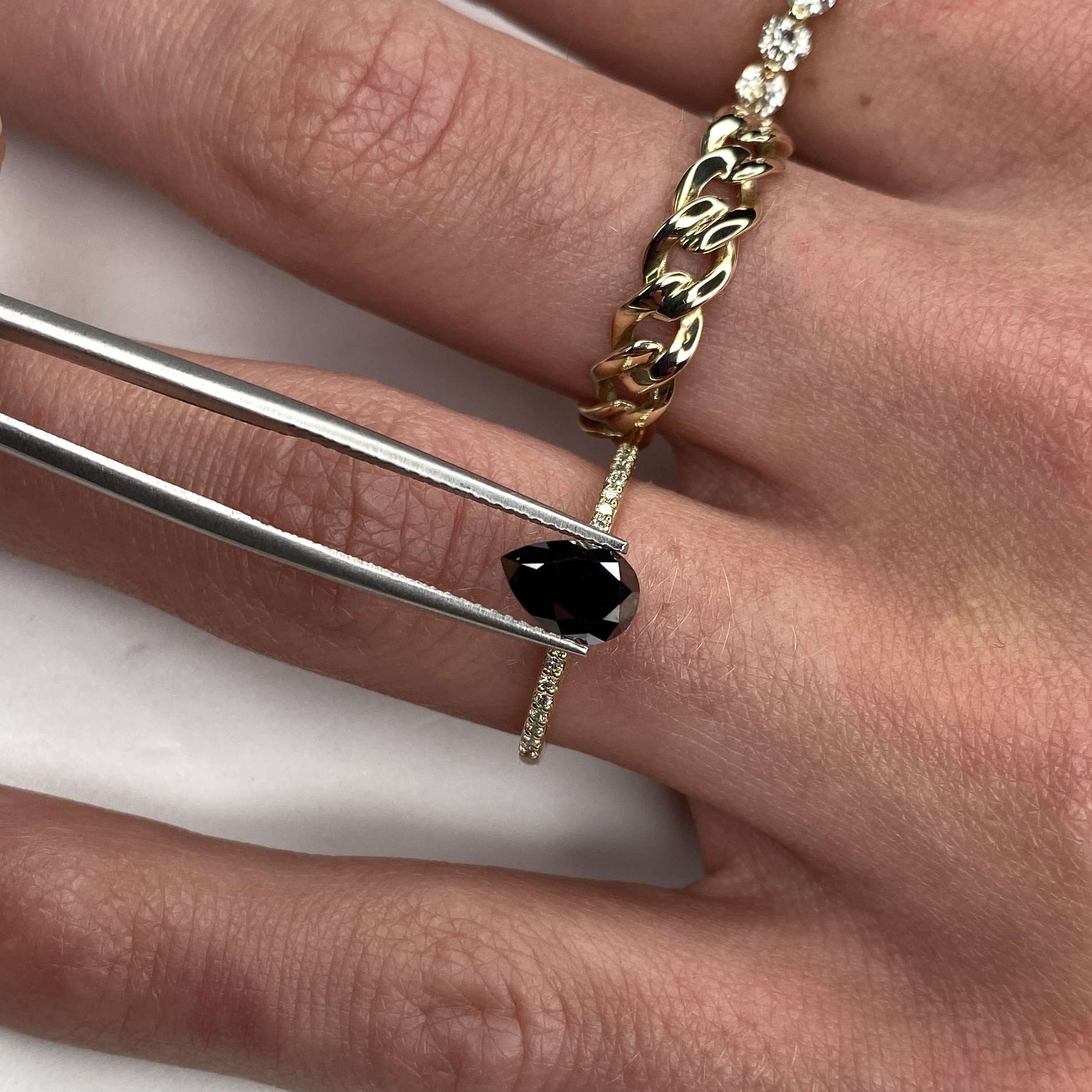 This diamond has been treated to achieve its rich, lustrous black hue, giving it a luxurious appearance that stands out beautifully in both contemporary and classic jewellery designs. The pear cut, often called the teardrop shape, combines soft curves with a refined point to create a graceful and eye-catching silhouette.