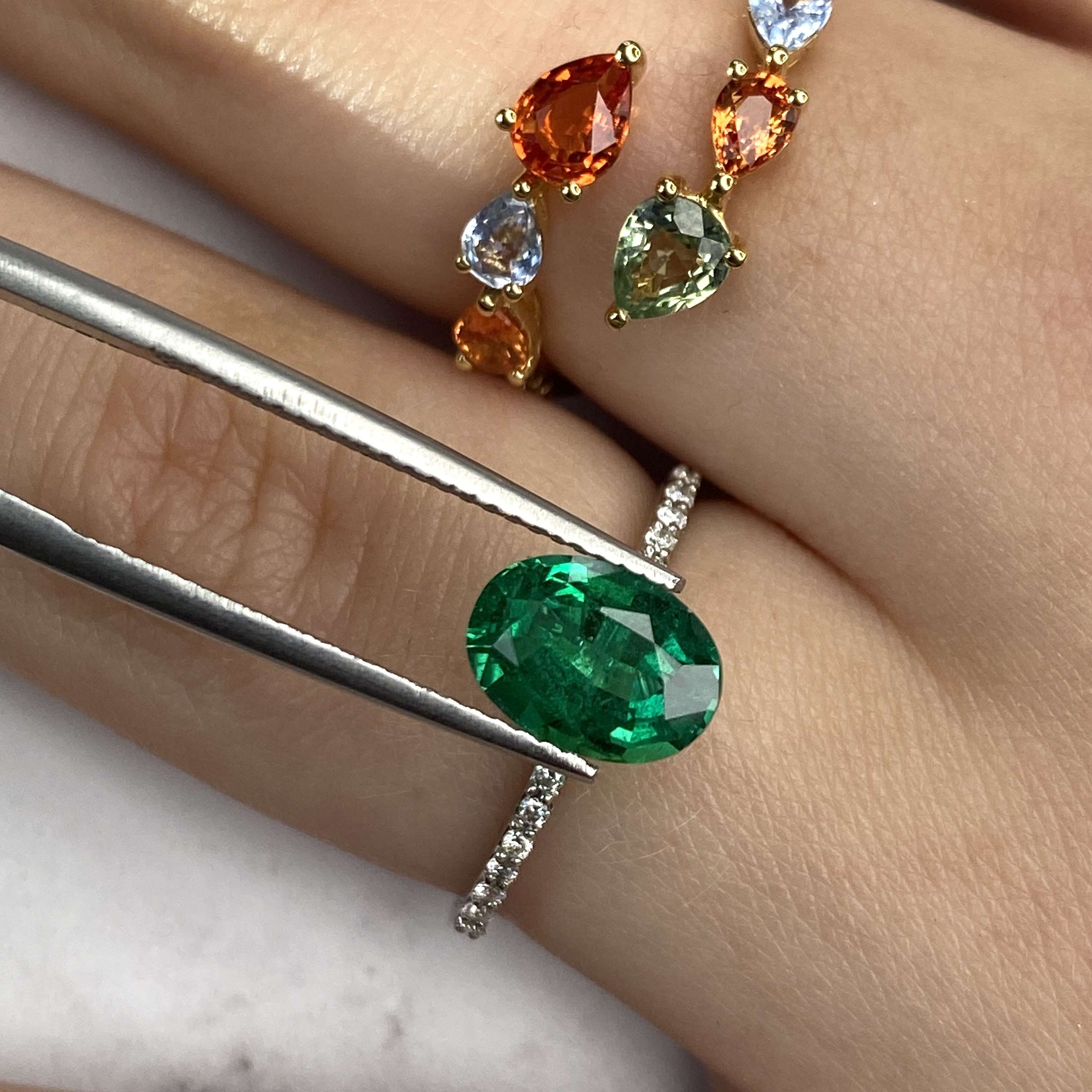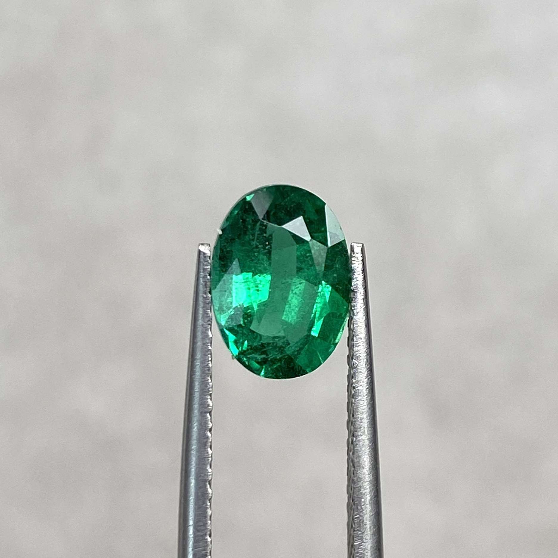 The oval cut enhances the emerald’s natural brilliance while creating a soft, elongated silhouette that flatters a variety of jewellery designs. Weighing 1.44 carats and measuring approximately 8.50 x 6.10mm, this gemstone offers a strong and elegant presence, ideal as a centrepiece for bespoke jewellery.