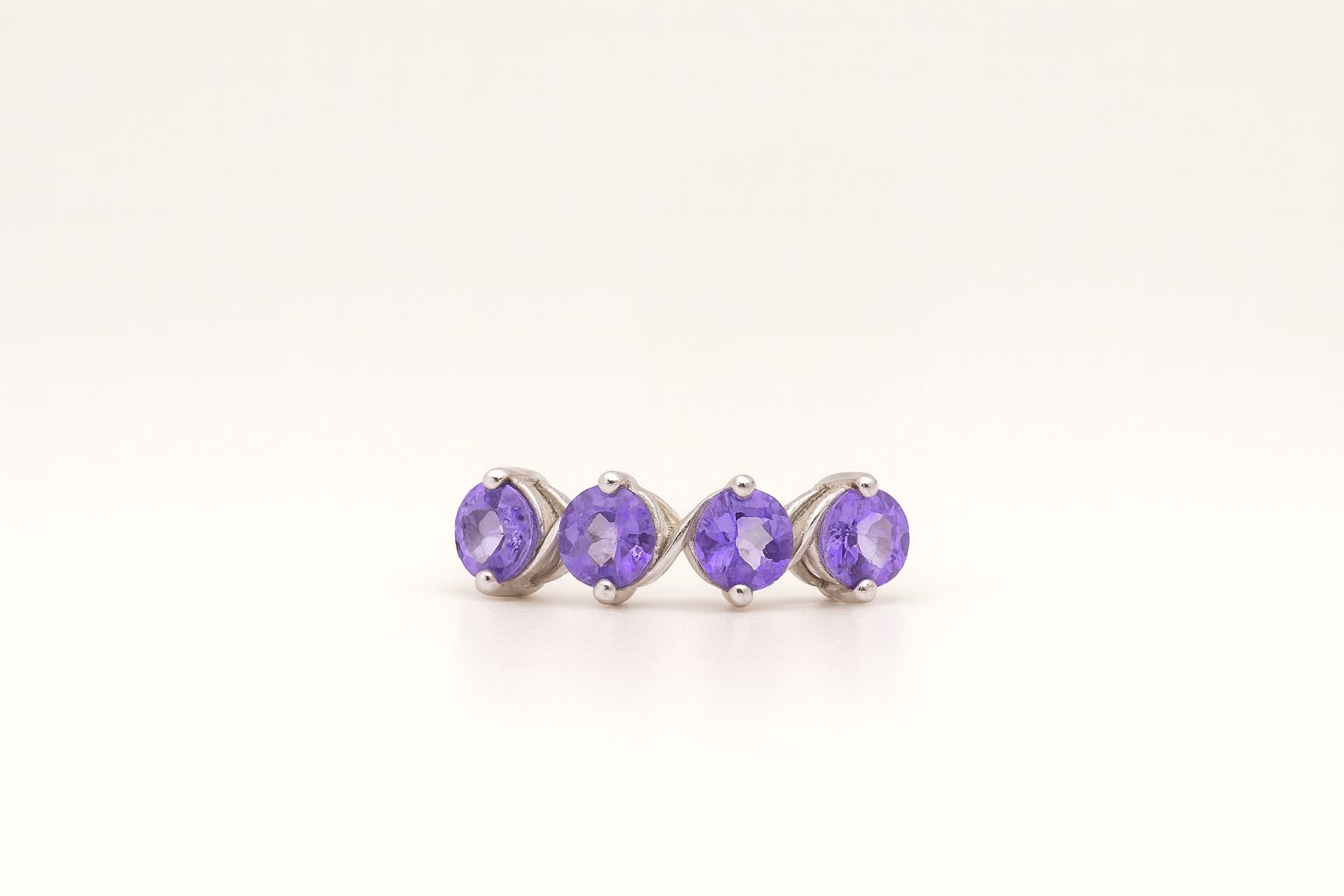 A refined expression of creativity and modern elegance, this four-stone Tanzanite ring brings together bold colour and artistic design in a way that feels both unique and effortlessly wearable. Featuring four round natural Tanzanites with a combined weight of 0.86 carats, each gemstone is set to showcase its vivid lavender-blue glow—a hue celebrated for its calming, dreamlike beauty.