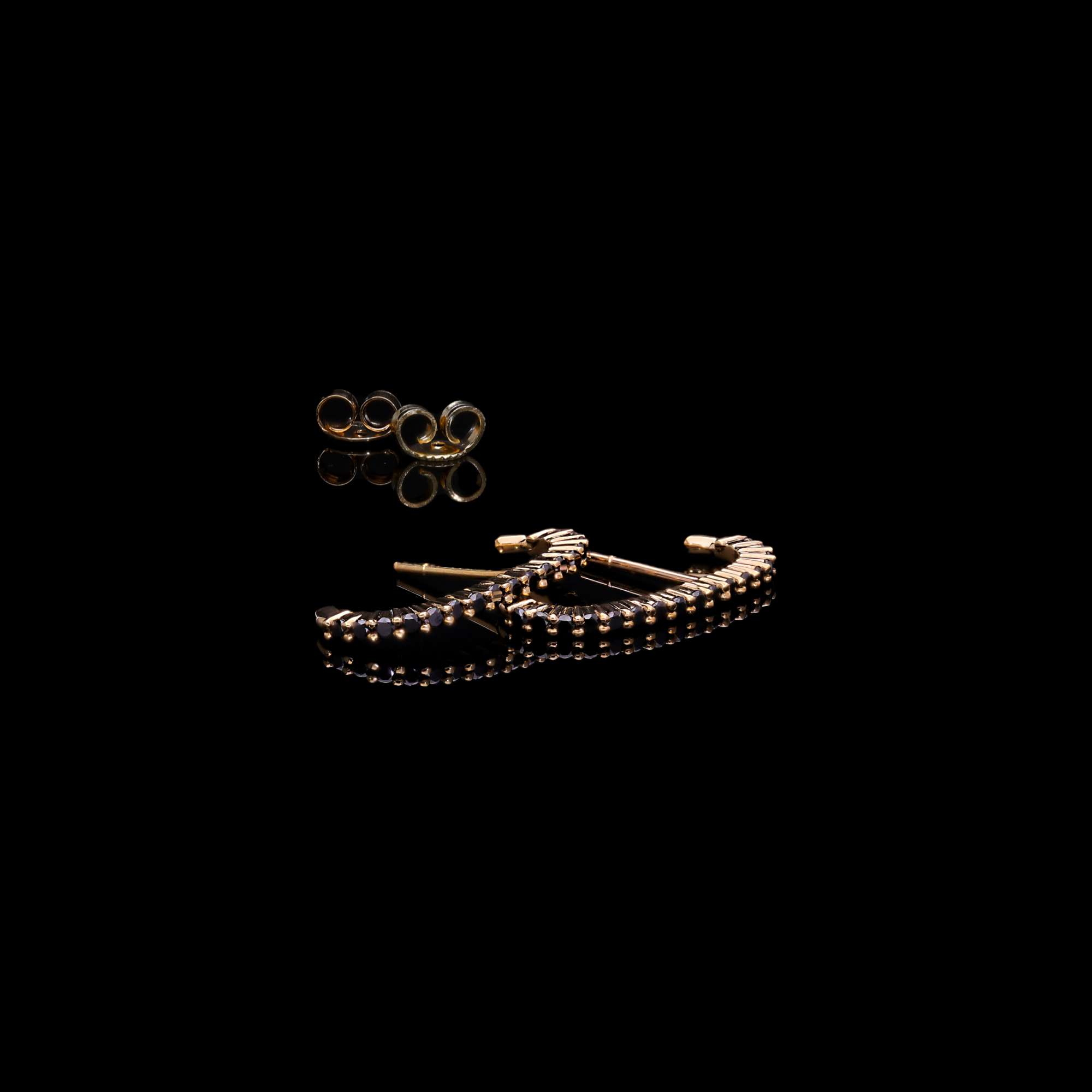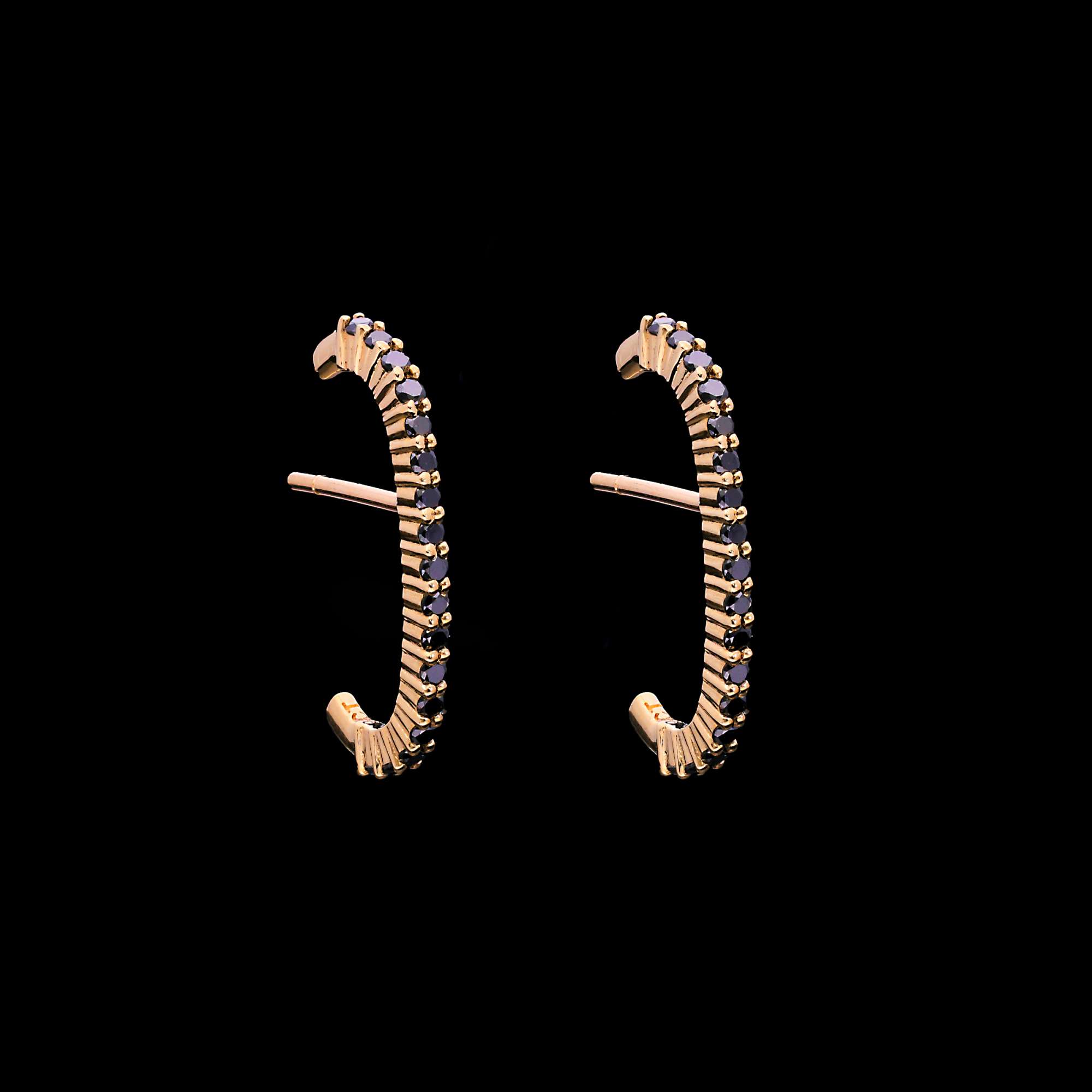 Bold, modern, and beautifully distinctive, these C-shaped stud earrings showcase 34 natural black diamonds (0.015 Ct each) meticulously set to create a sleek, continuous curve of dark brilliance. Crafted in luxurious 9k yellow gold, the warm metal contrasts strikingly with the rich, midnight hue of the diamonds, resulting in a look that is both contemporary and refined.