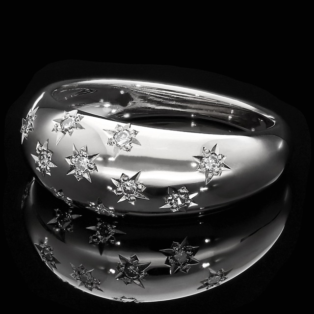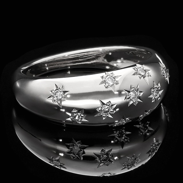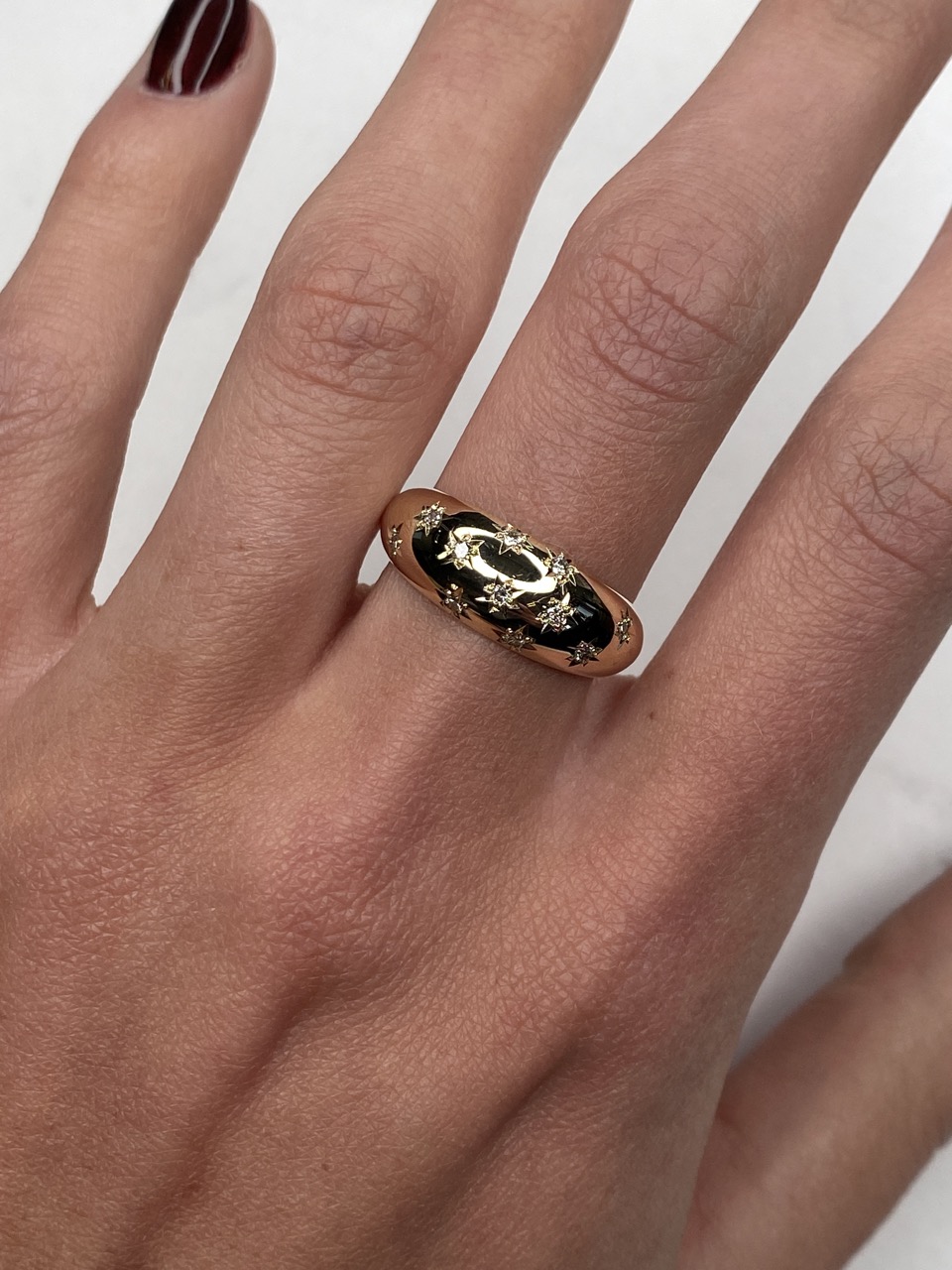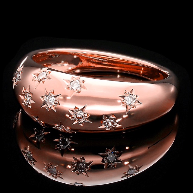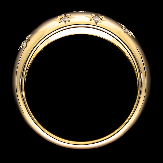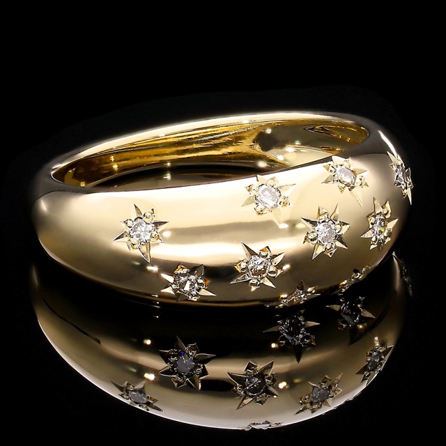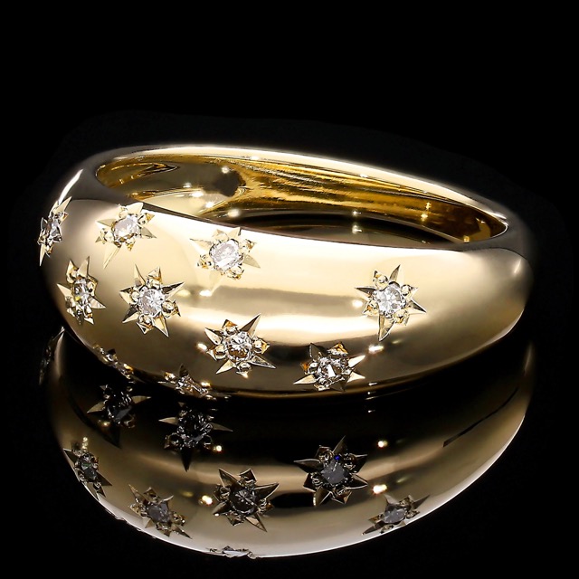 The harmonious blend of gold and diamonds creates a luminous effect, making this ring a perfect statement piece for any occasion. The dome design ensures comfort and elegance, while the star-set diamonds add a touch of celestial charm and sparkle.