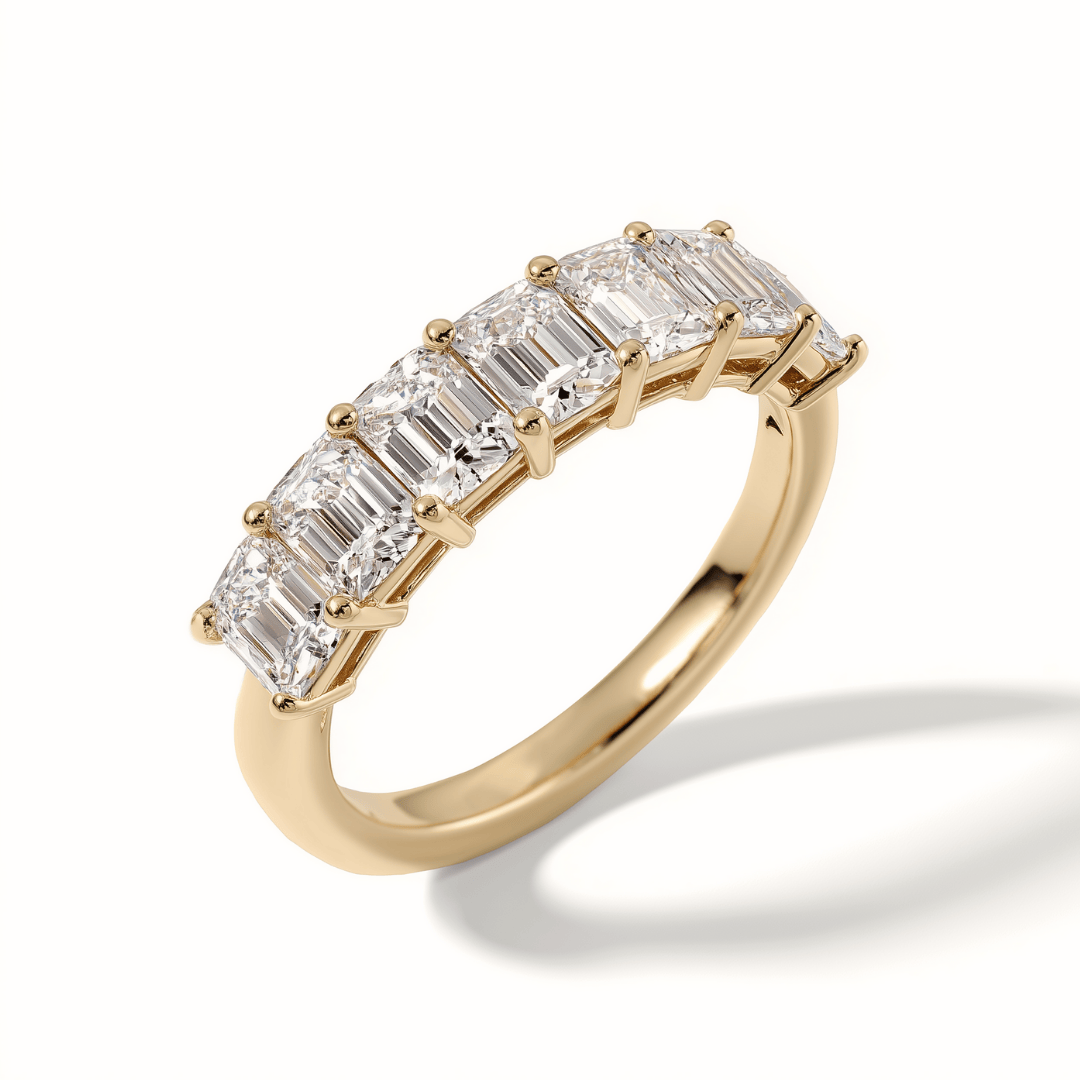 The Emerald Eternity Ring features seven stunning emerald lab-grown diamonds, each with a weight of 0.51 carats. The emeralds are meticulously set in an eternity design, creating a captivating and unique piece that exudes elegance and grace.