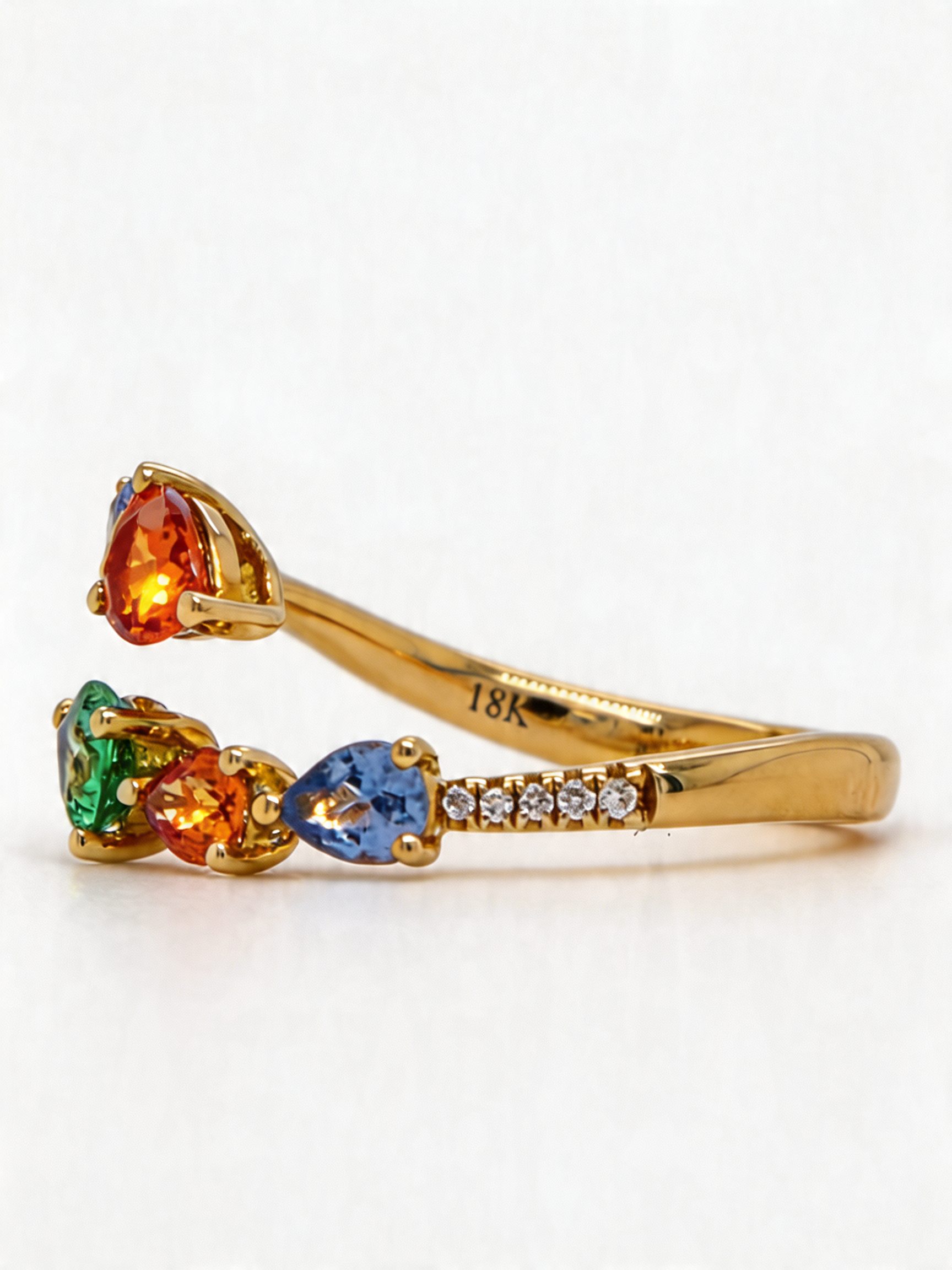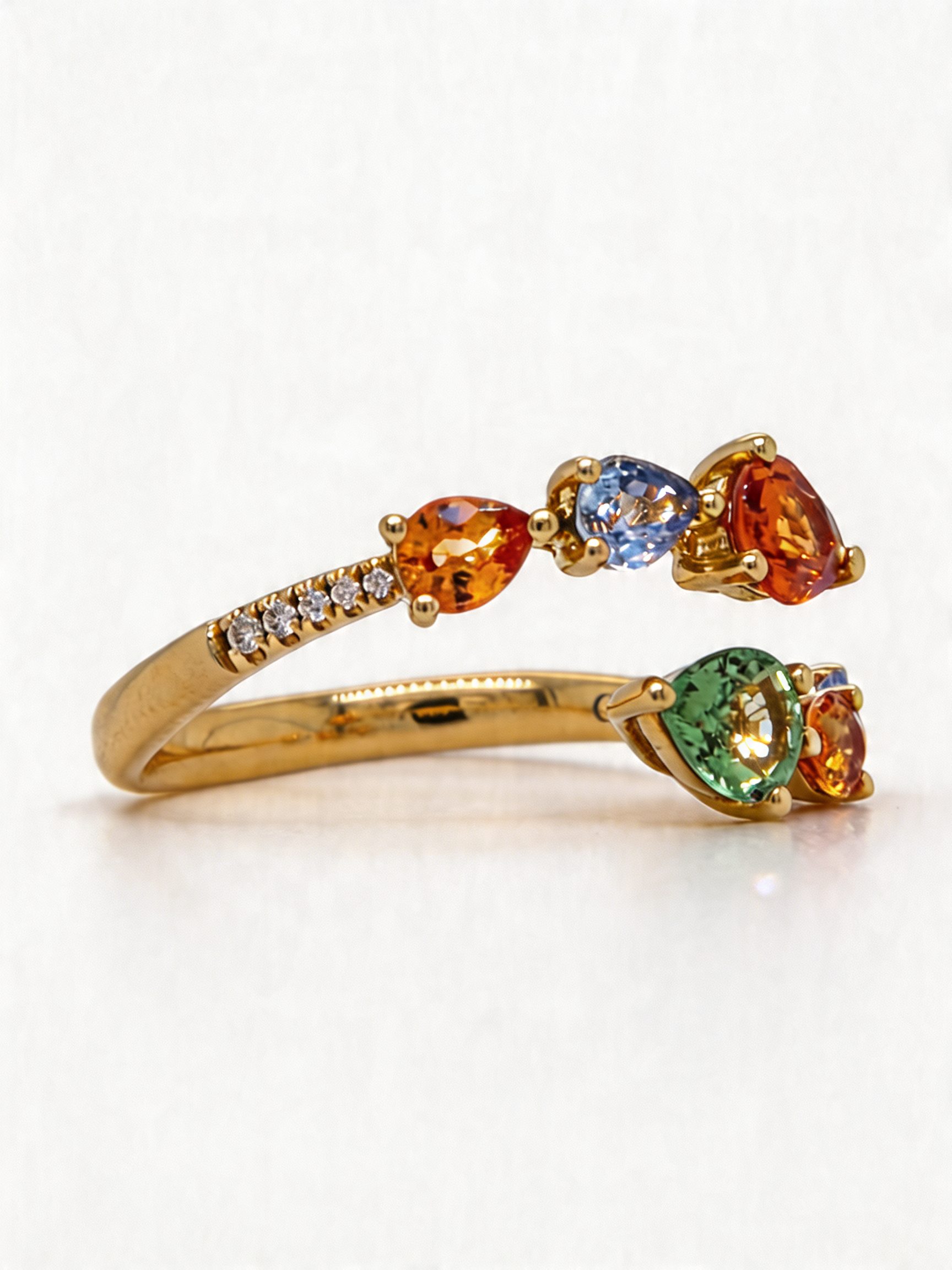 From fiery orange tones to soft lilacs, gentle greens, and warm golden hues, the sapphires form a radiant spectrum of colour that appears to glow with movement and light. This colourful arrangement creates a dreamlike visual effect, making the ring feel alive with personality and charm.