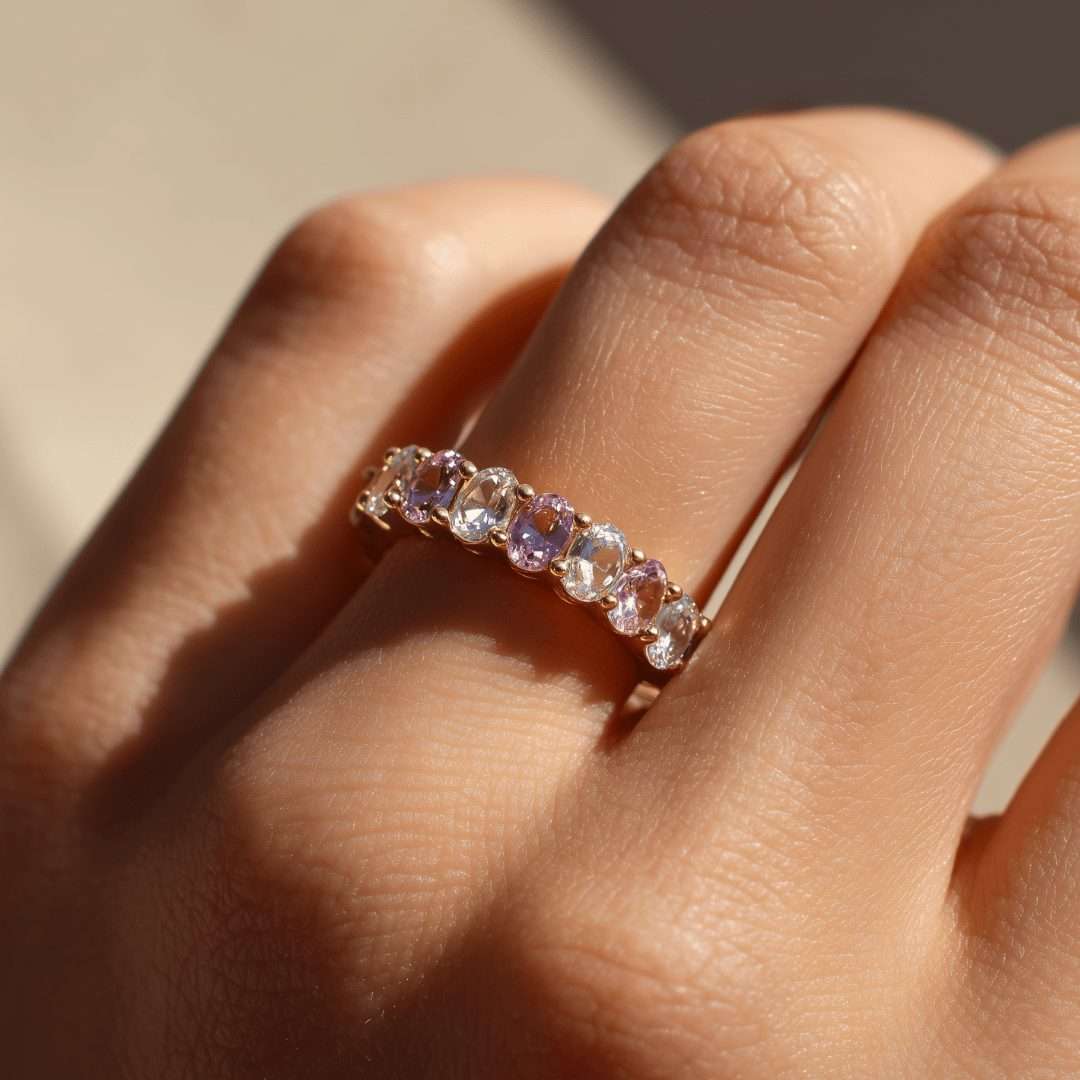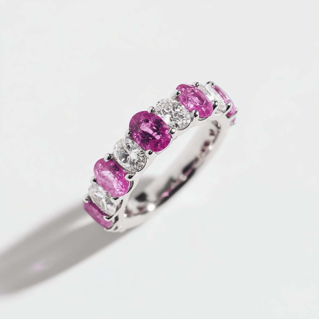 The Oval Pink and White Eternity Ring features a captivating combination of five natural pink sapphires and six oval lab-grown diamonds. The sapphires and diamonds, meticulously set in an eternity design, create a unique and alluring piece that exudes opulence and grace.