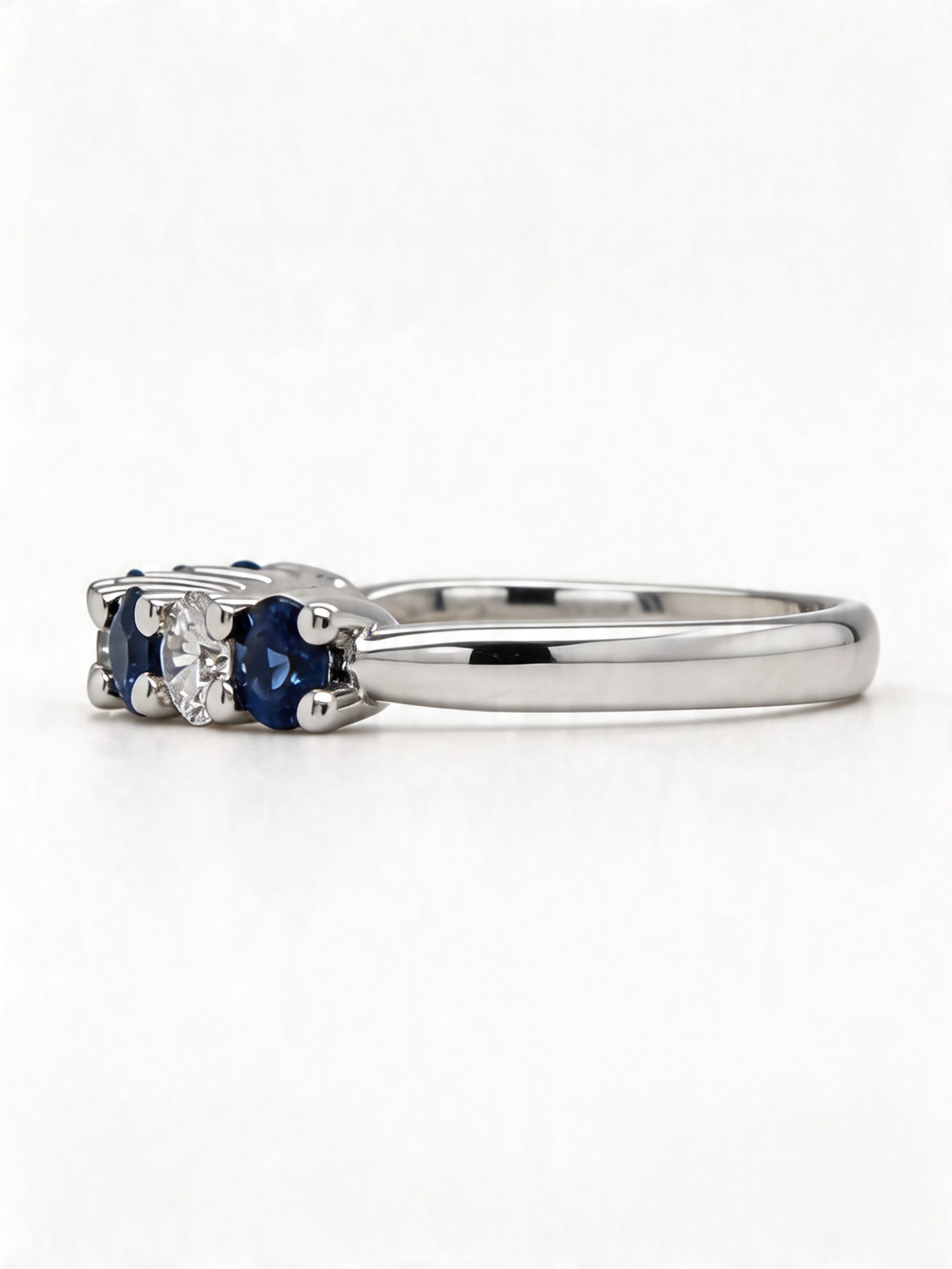 The deep royal-blue sapphires bring depth and sophistication to the design, their velvety hues symbolising wisdom, loyalty, and strength. Paired alongside sparkling white diamonds, the ring captures a captivating contrast — the sapphires providing bold colour while the diamonds reflect light with classic brilliance. Set in cool-toned white gold, each gemstone appears even more vibrant, creating a refined and luxurious finish.