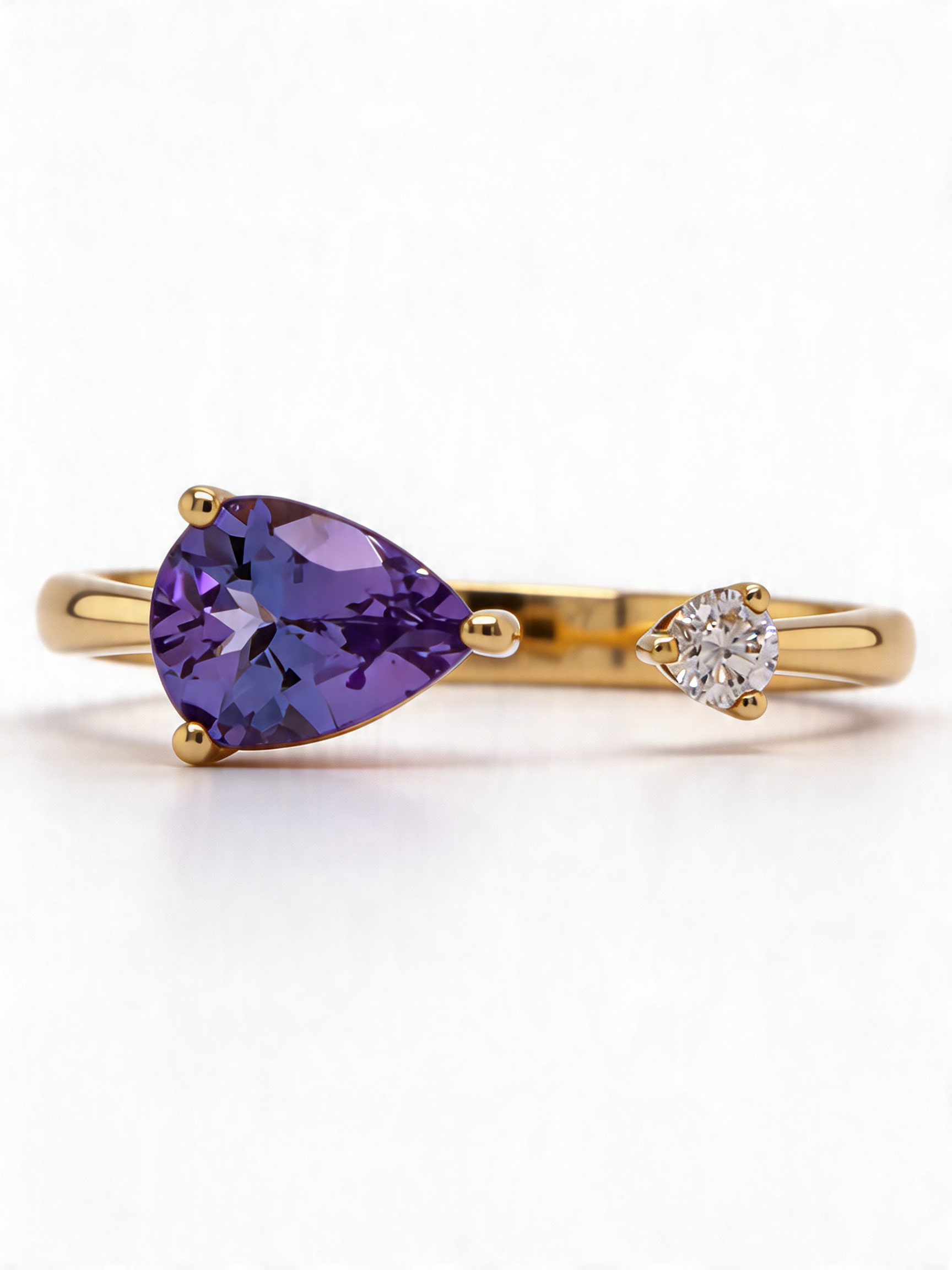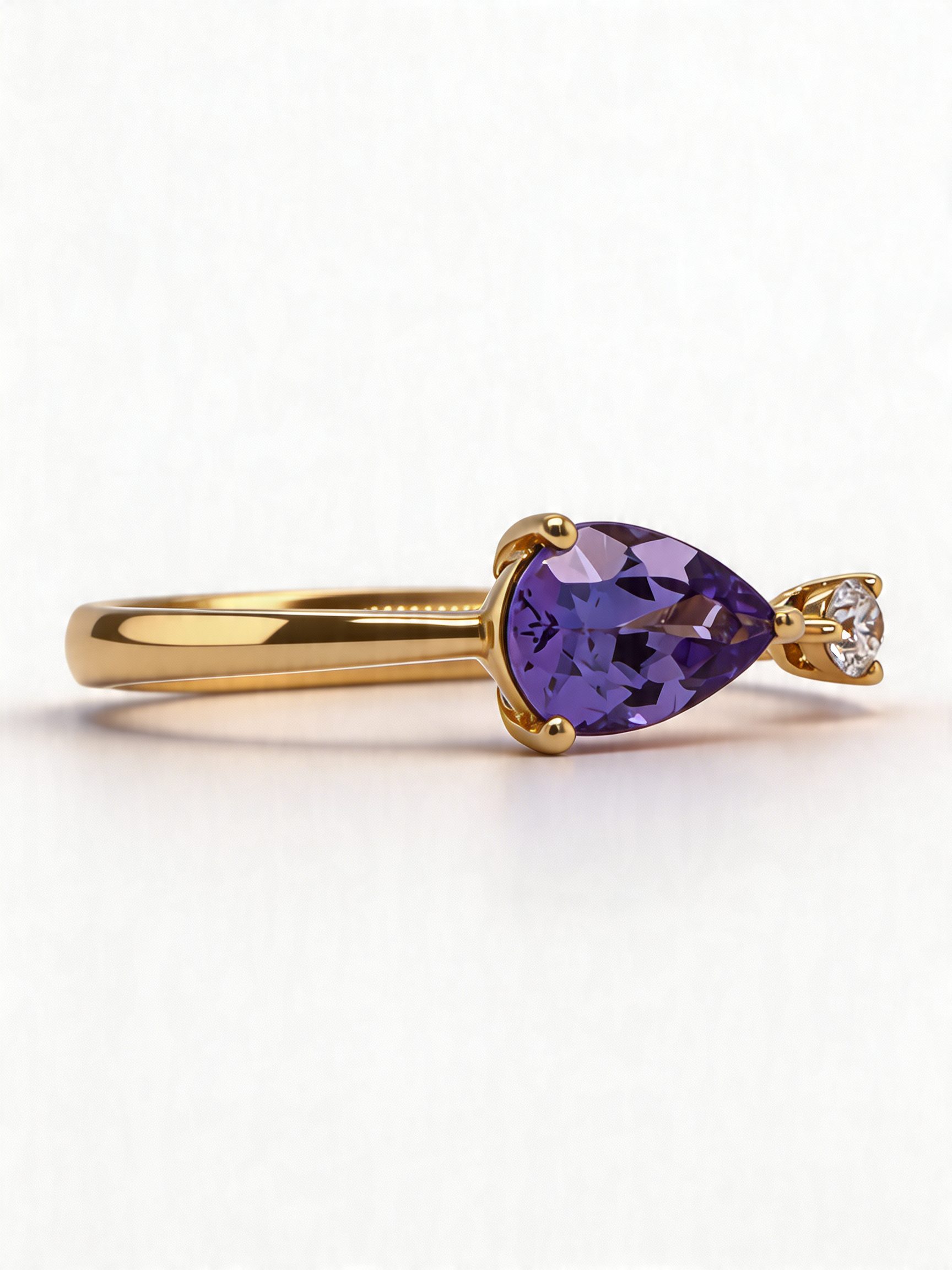 The vivid violet-blue hue of the tanzanite creates a beautiful focal point, glowing richly against the warm golden band. Known for its striking colour and rarity, tanzanite brings an element of individuality and charm to the design. Complementing the gemstone perfectly, the round white diamond adds a delicate sparkle that enhances the ring’s balanced and refined aesthetic.