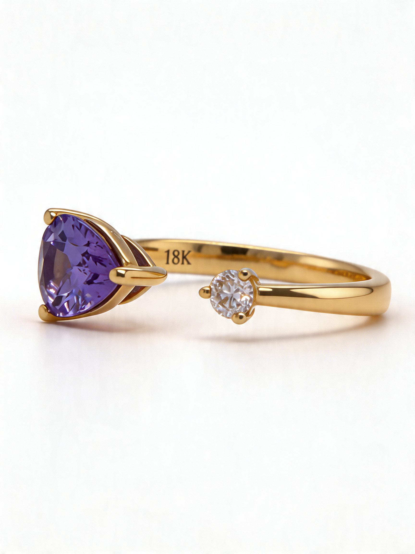The open-ended band creates a soft, sculptural silhouette that feels both contemporary and graceful. This minimalist structure allows each stone to stand out individually while maintaining a harmonious balance between colour and brilliance. The contrast between the deep violet-blue tanzanite and the crisp sparkle of the diamond creates a design that is both artistic and timeless.