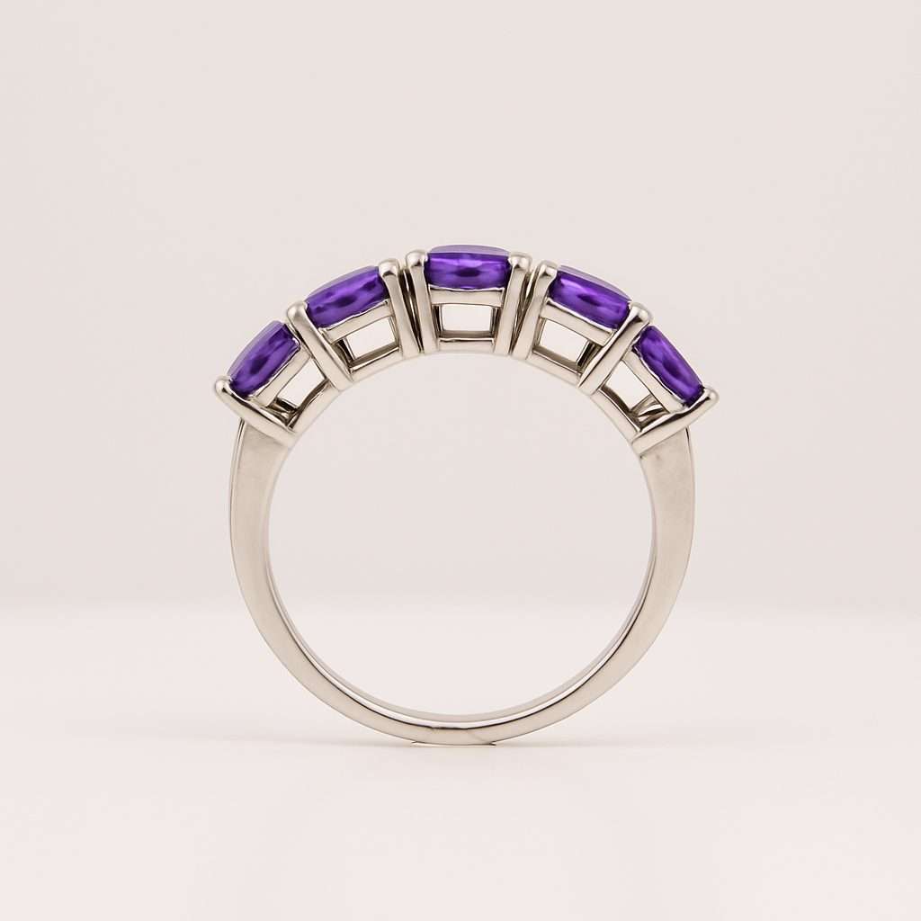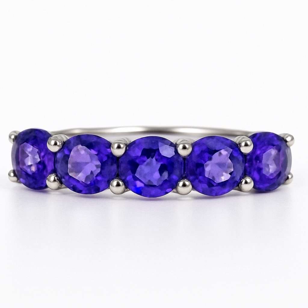Set with a total gemstone weight of 1.66 carats, the ring features a row of elegant oval-shaped tanzanites carefully arranged along the band. The elongated oval cut allows each stone to capture light beautifully, producing a soft glow that shifts between lavender, deep blue, and hints of indigo depending on the lighting. This natural colour change gives the ring a lively and enchanting character.