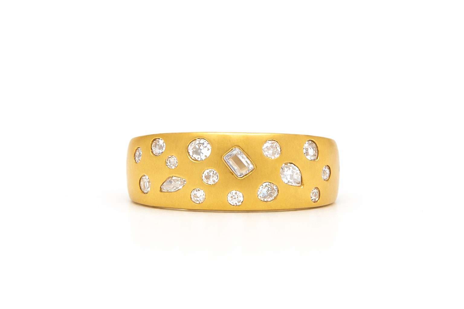 Each diamond is thoughtfully positioned to create a beautiful scattered effect across the satin-finished gold band. This artistic placement gives the ring a dynamic, almost celestial appearance—resembling a constellation of diamonds set against warm golden light. The varied diamond shapes add movement and visual intrigue while maintaining a balanced and refined aesthetic.