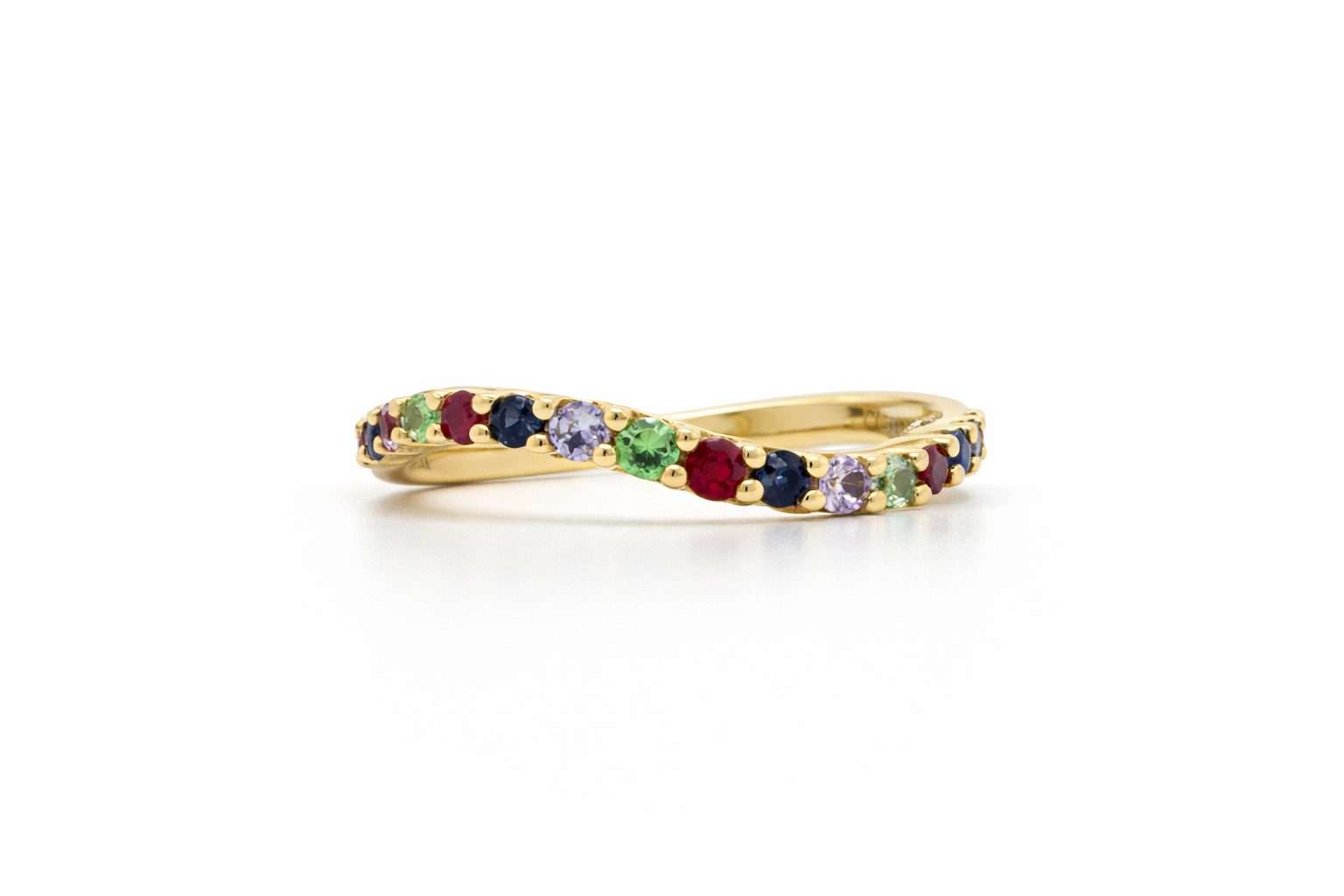 The gemstones are set within a gently twisting silhouette that introduces movement and dimension to the ring. This subtle sculptural detail enhances the playful spirit of the design while maintaining a sense of elegance and sophistication. The result is a ring that feels expressive and artistic without sacrificing timeless appeal.