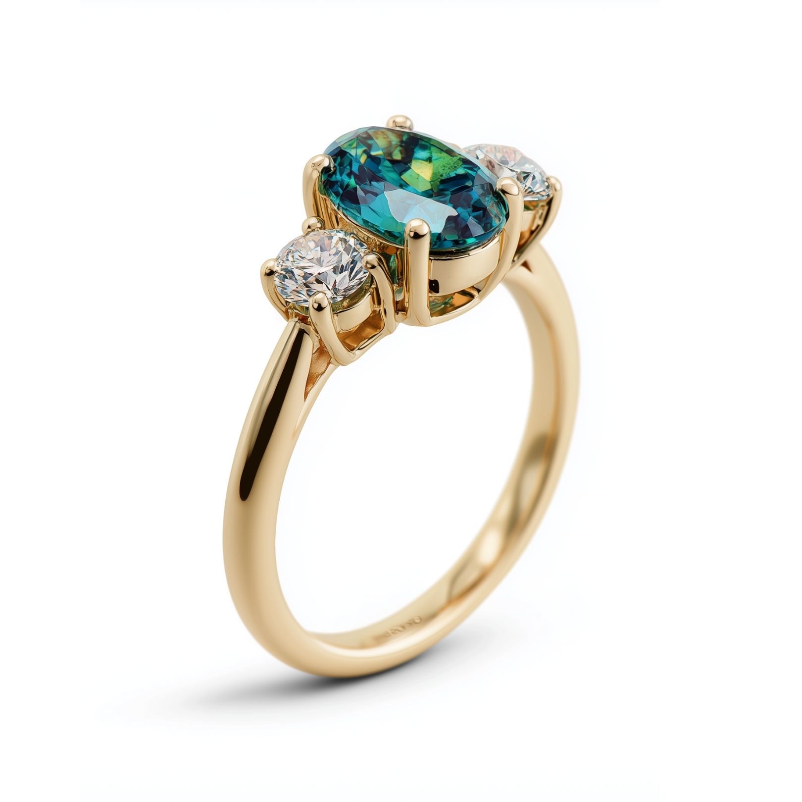 Introducing our exquisite Yellow Gold Blue-Green Sapphire Trilogy Ring, a truly special piece that captures the essence of elegance and individuality. Crafted with care and precision, this ring features a stunning 1.14-carat Oval Blue-Green Sapphire, complemented by two 0.08 Ct IJ/SI Round Diamonds, set in the warmth of 9K Yellow Gold.